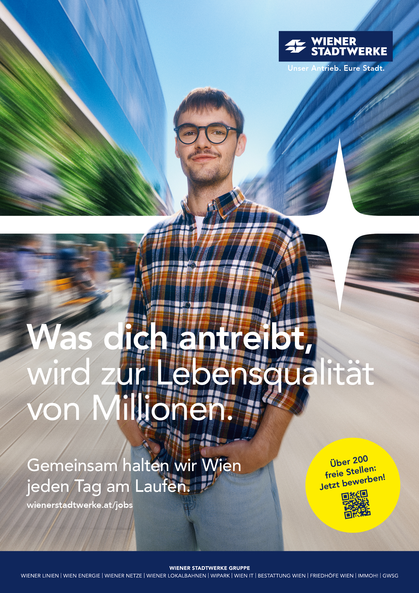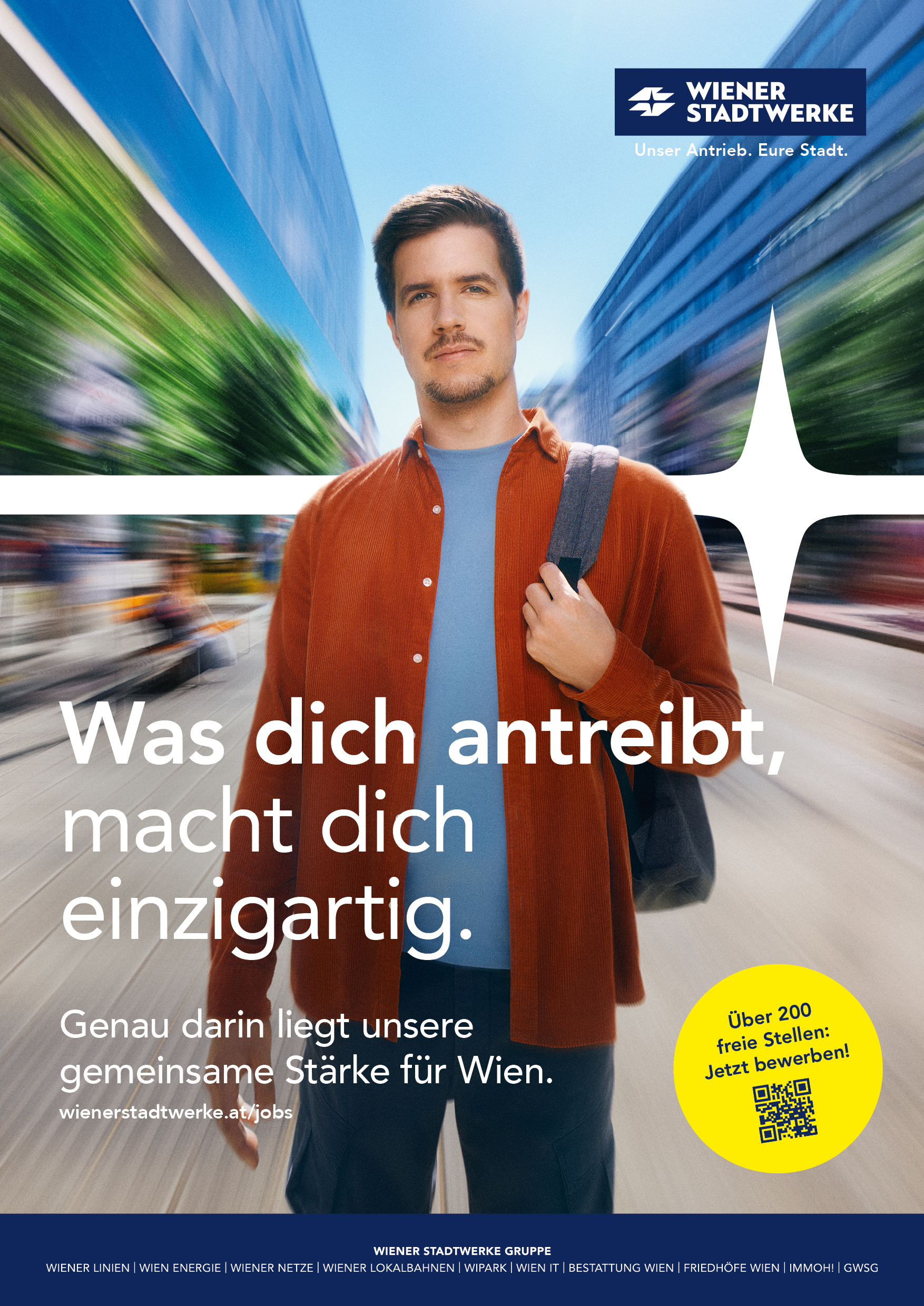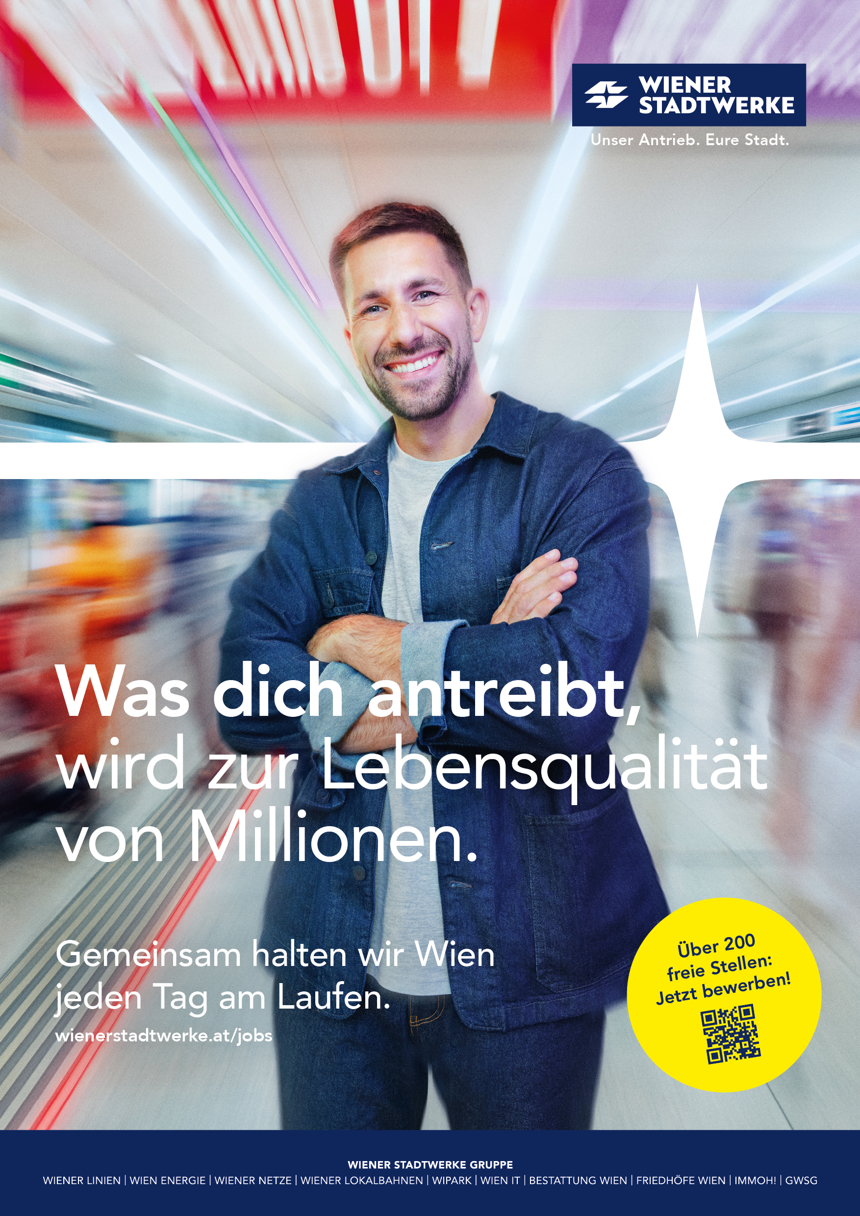 Die Employer-Branding-Kampagne der Wiener Stadtwerke zeigt den gemeinsamen Einsatz ihrer Mitarbeiter*innen in ganz Wien, die täglich zur Versorgung und Lebensqualität der Wiener*innen beitragen. Der „Puls der Wiener Stadtwerke“ steht dabei für den Zusammenhalt und das Zusammenspiel von Menschen, Aufgaben und Wirkung. So entsteht ein klares und authentisches Markenbild, das Engagement, Teamgeist und Identifikation vermittelt.