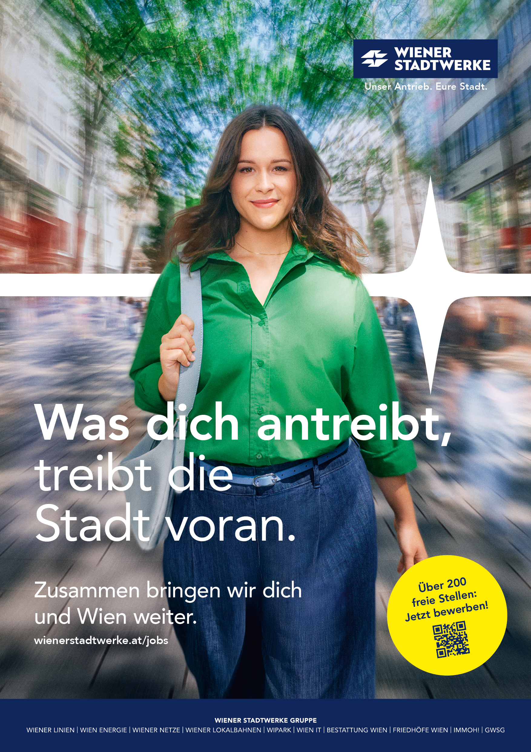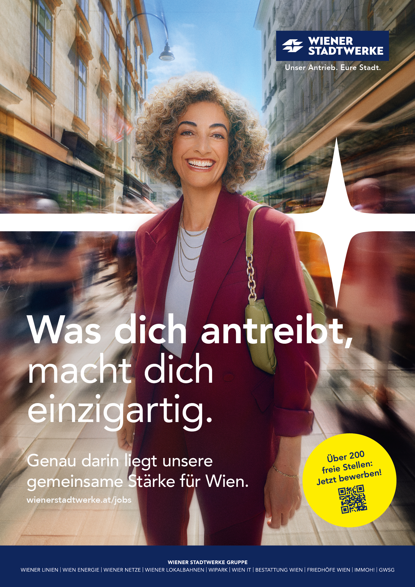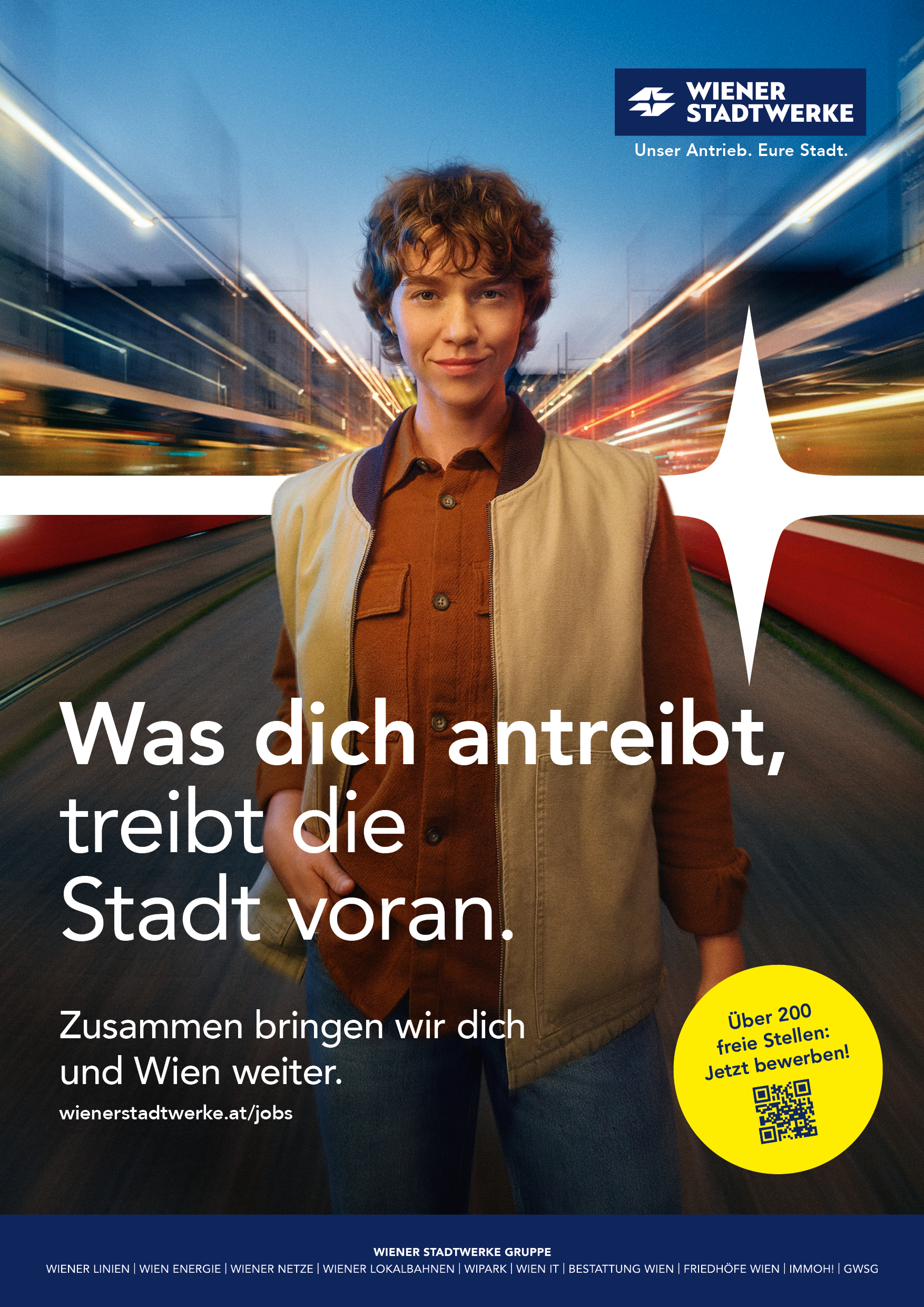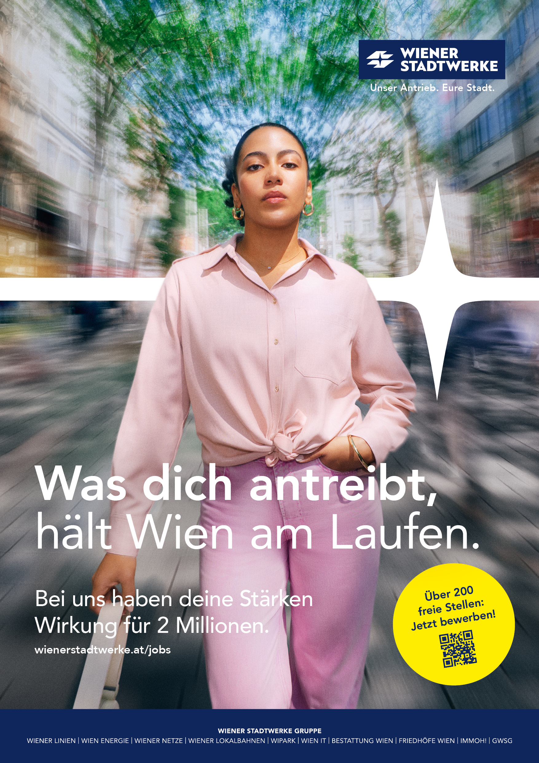 Die Employer-Branding-Kampagne der Wiener Stadtwerke zeigt den gemeinsamen Einsatz ihrer Mitarbeiter*innen in ganz Wien, die täglich zur Versorgung und Lebensqualität der Wiener*innen beitragen. Der „Puls der Wiener Stadtwerke“ steht dabei für den Zusammenhalt und das Zusammenspiel von Menschen, Aufgaben und Wirkung. So entsteht ein klares und authentisches Markenbild, das Engagement, Teamgeist und Identifikation vermittelt.